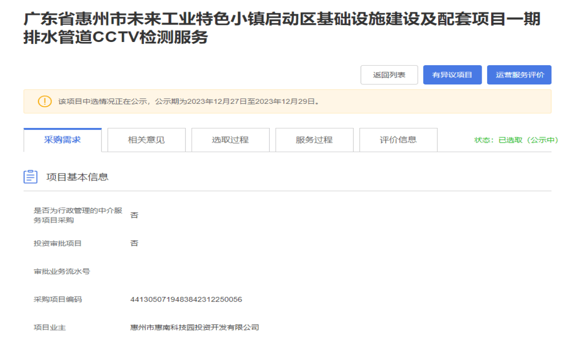 【招標(biāo)公示】廣東省惠州市未來工業(yè)特色小鎮(zhèn)啟動(dòng)區(qū)基礎(chǔ)設(shè)施建設(shè)及配套項(xiàng)目一期排水管道CCTV檢測服務(wù)