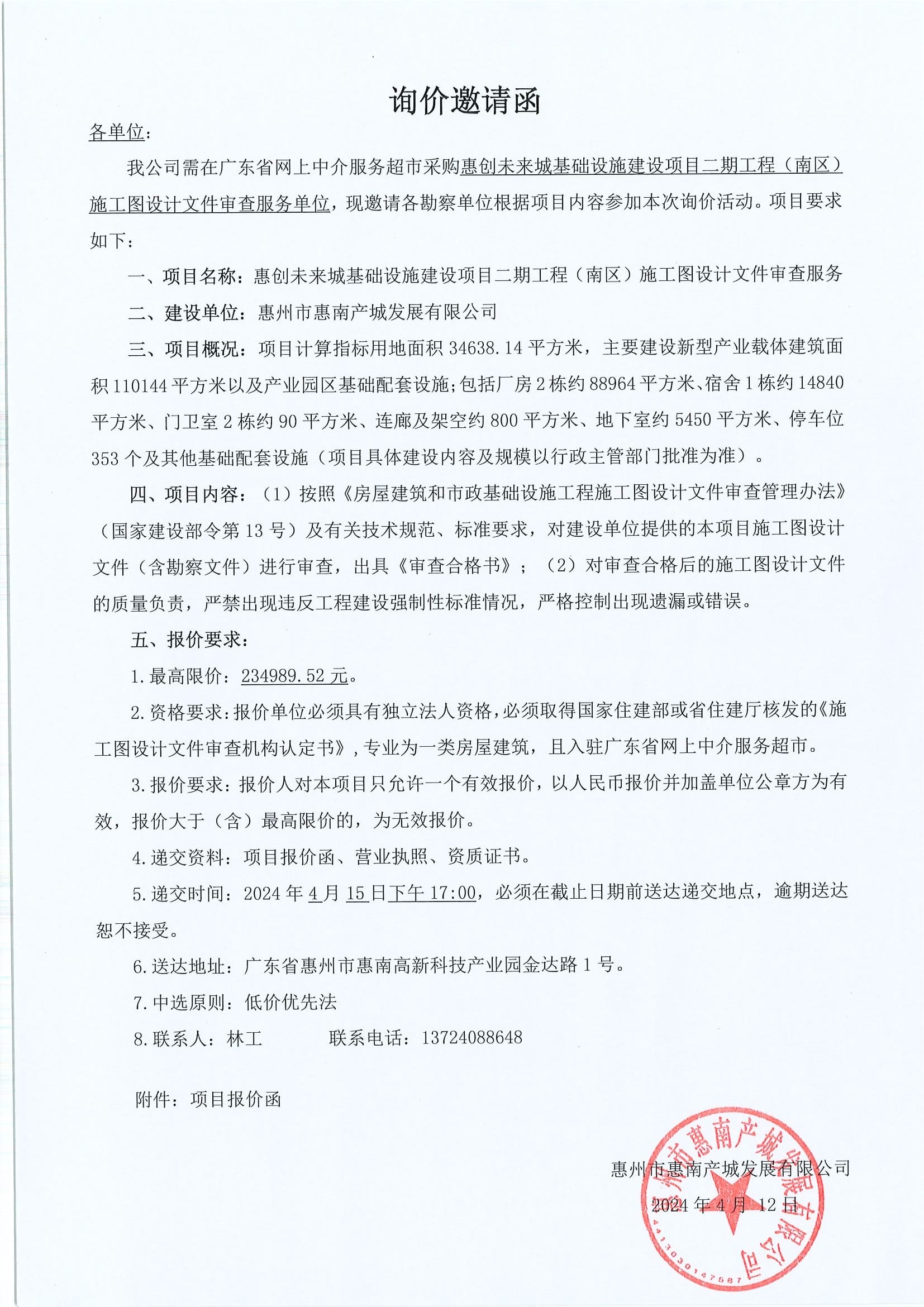 惠創(chuàng)未來(lái)城基礎(chǔ)設(shè)施建設(shè)項(xiàng)目二期工程(南區(qū))施工圖設(shè)計(jì)文件審查服務(wù)詢價(jià)邀請(qǐng)函