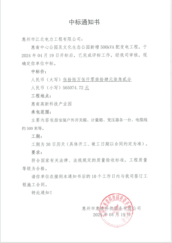 【中標(biāo)通知】惠南中心公園及文化生態(tài)公園新增500kVA配變電工程