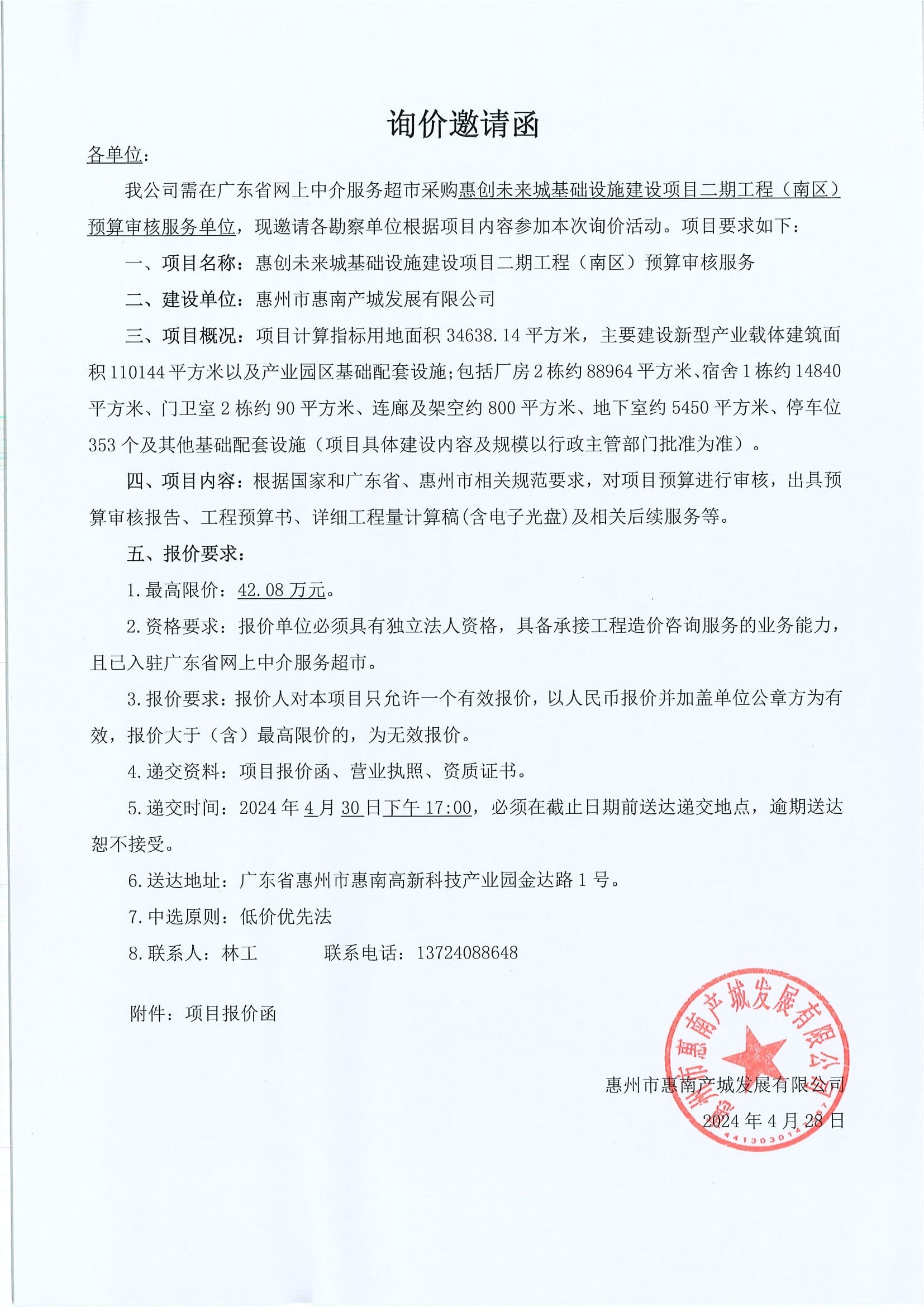 惠創(chuàng)未來城基礎(chǔ)設(shè)施建設(shè)項目二期工程(南區(qū))預(yù)算審核服務(wù)詢價邀請函