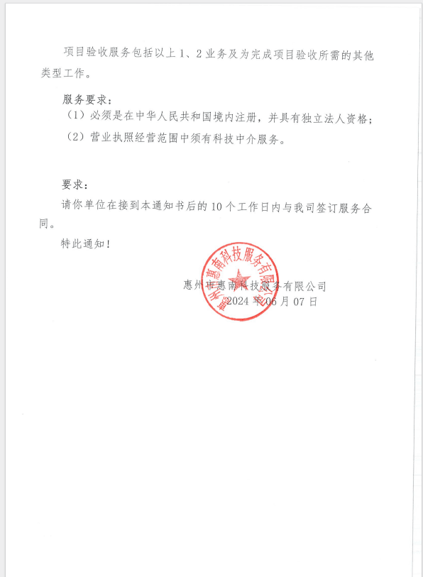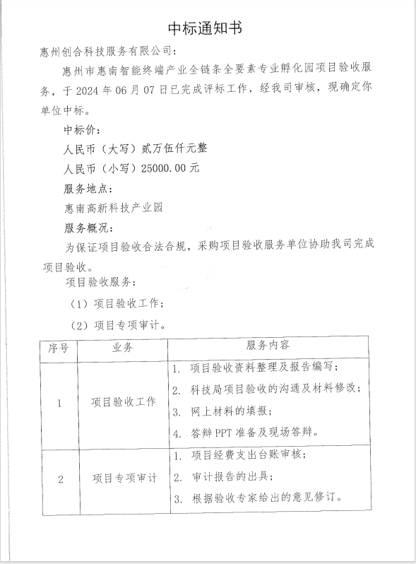 【中標(biāo)通知】惠州市惠南智能終端產(chǎn)業(yè)全鏈條全要素專業(yè)孵化園項目驗收服務(wù)