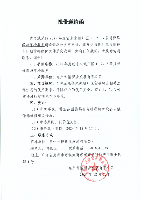 【報價邀請函】采購2026年惠創(chuàng)未來城廠區(qū)1、2、3、4號貨梯維保與年檢服務(wù)