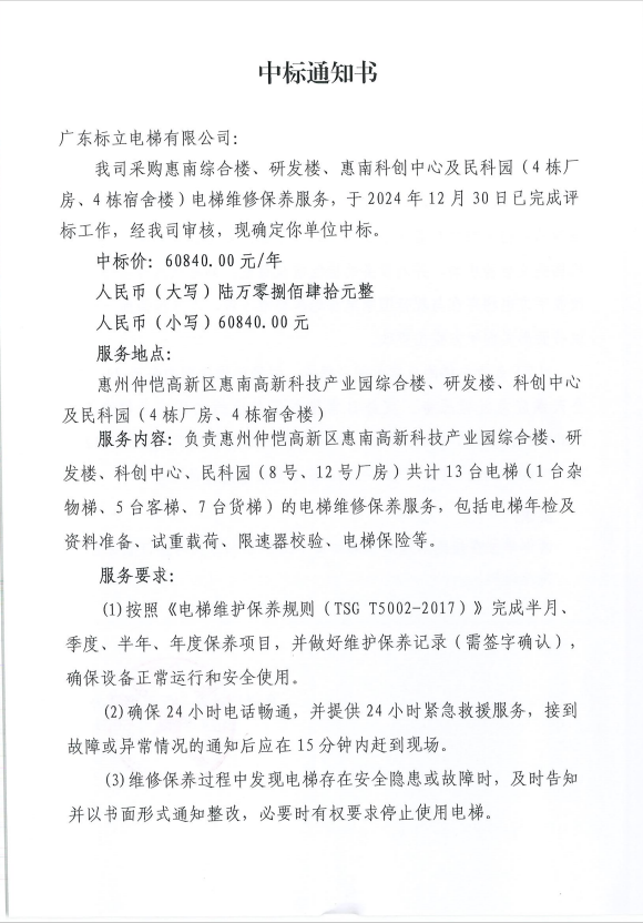 【中標通知】采購惠南綜合樓、研發(fā)樓、惠南科創(chuàng)中心及民科園(4棟廠房、4棟宿舍樓)電梯維修保養(yǎng)服務