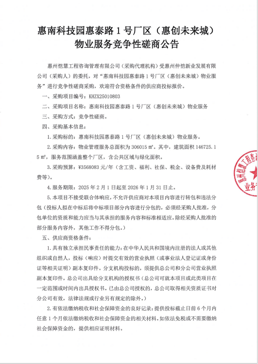 惠南科技園惠泰路1號廠區(qū)(惠創(chuàng)未來城) 物業(yè)服務(wù)競爭性磋商公告