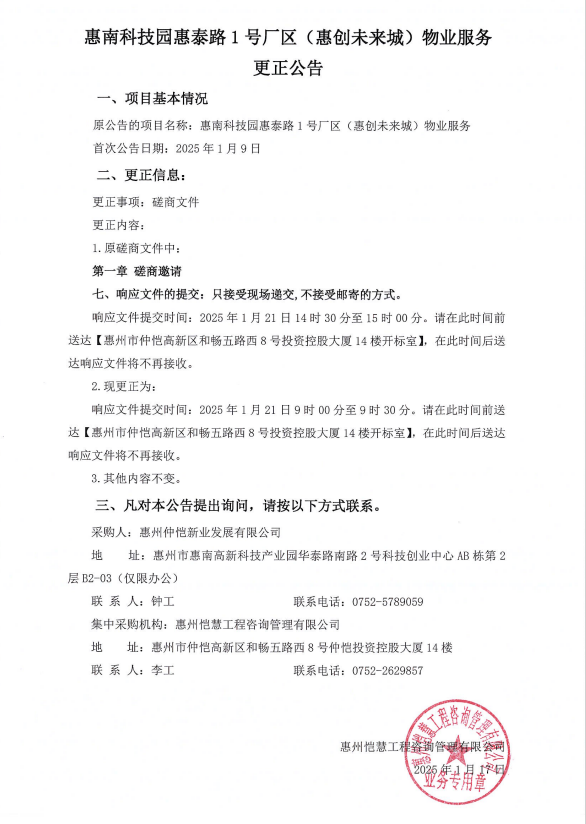 惠南科技園惠泰路1號廠區(qū)(惠創(chuàng)未來城)物業(yè)服務(wù)更正公告