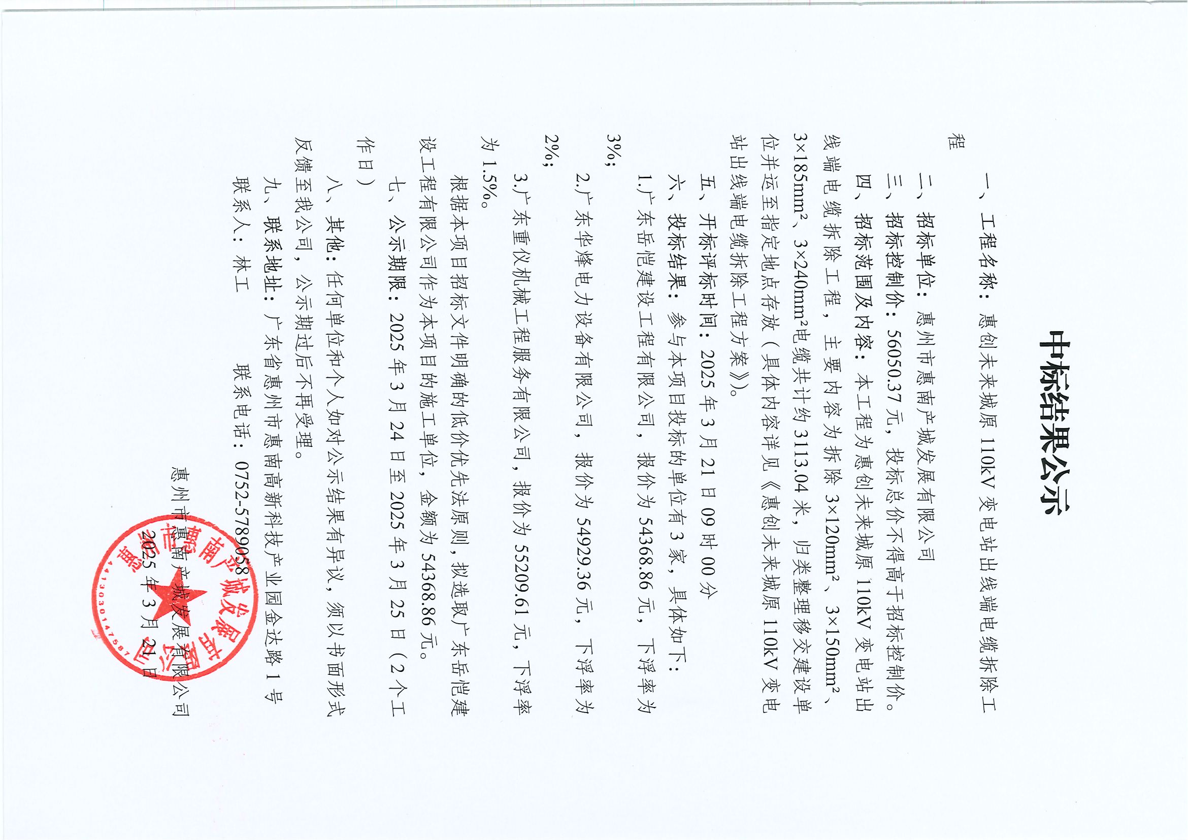 【中標(biāo)結(jié)果公示】惠創(chuàng)未來城原110kV變電站出線端電纜拆除工程