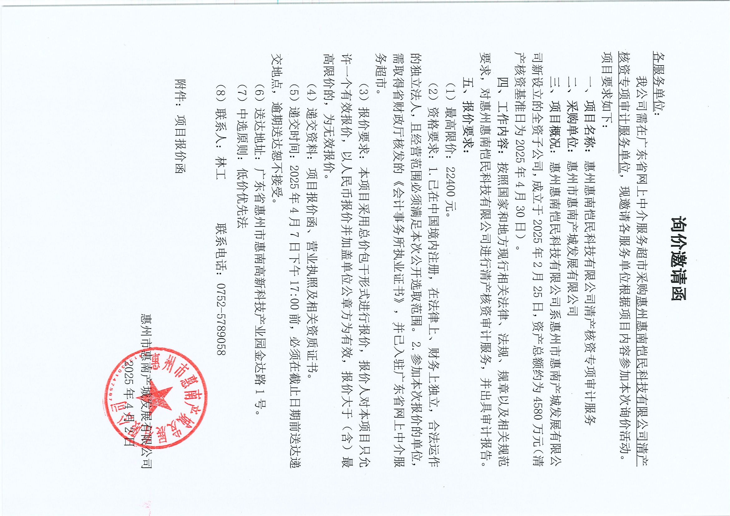 【詢價(jià)邀請(qǐng)函】惠州惠南愷民科技有限公司清產(chǎn)核資專項(xiàng)審計(jì)服務(wù)