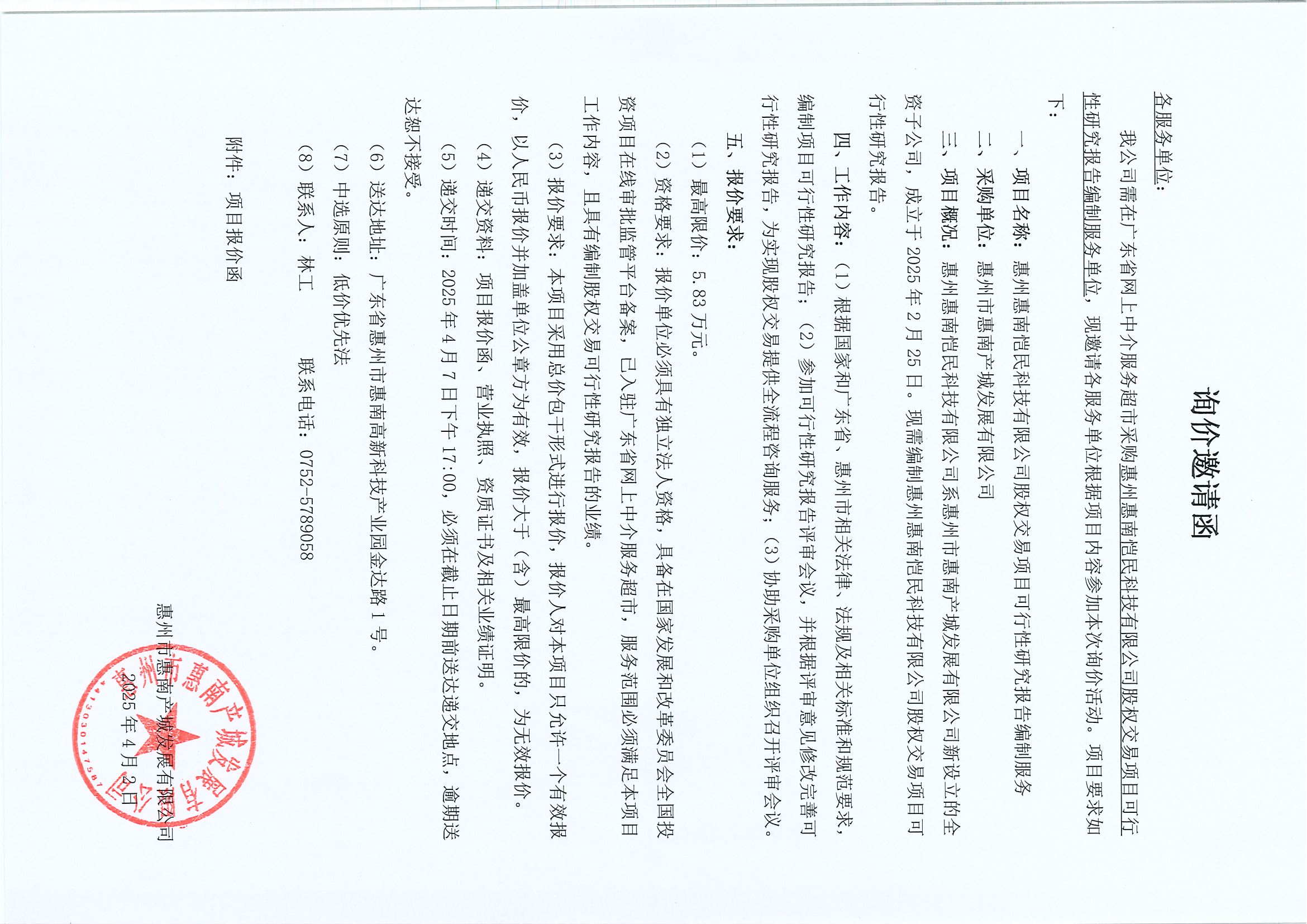 【詢價邀請函】惠州惠南愷民科技有限公司股權(quán)交易項目可行性研究報告編制服務