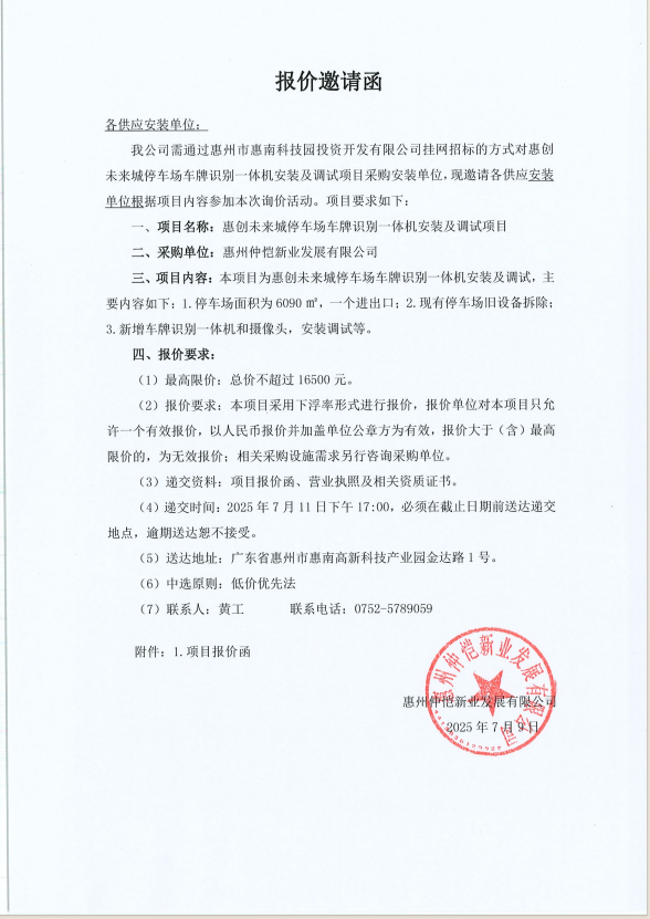 【報(bào)價(jià)邀請(qǐng)函】惠創(chuàng)未來(lái)城停車場(chǎng)車牌識(shí)別一體機(jī)安裝及調(diào)試項(xiàng)目采購(gòu)安裝單位