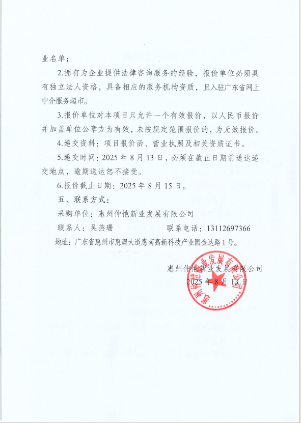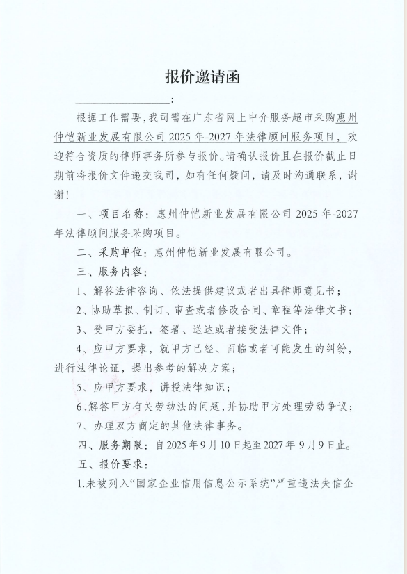 【報(bào)價(jià)邀請(qǐng)函】惠州仲愷新業(yè)發(fā)展有限公司2025年-2027年法律顧問服務(wù)采購項(xiàng)目