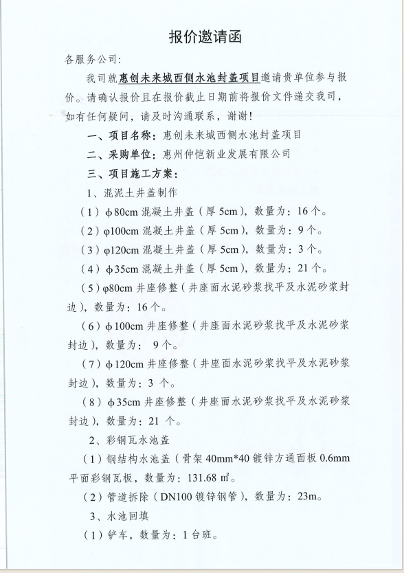 【報價邀請函】惠創(chuàng)未來城西側(cè)水池封蓋項目