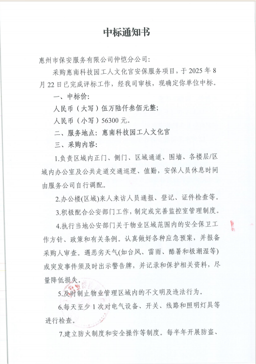 【中標(biāo)通知】采購(gòu)惠南科技園工人文化宮安保服務(wù)項(xiàng)目