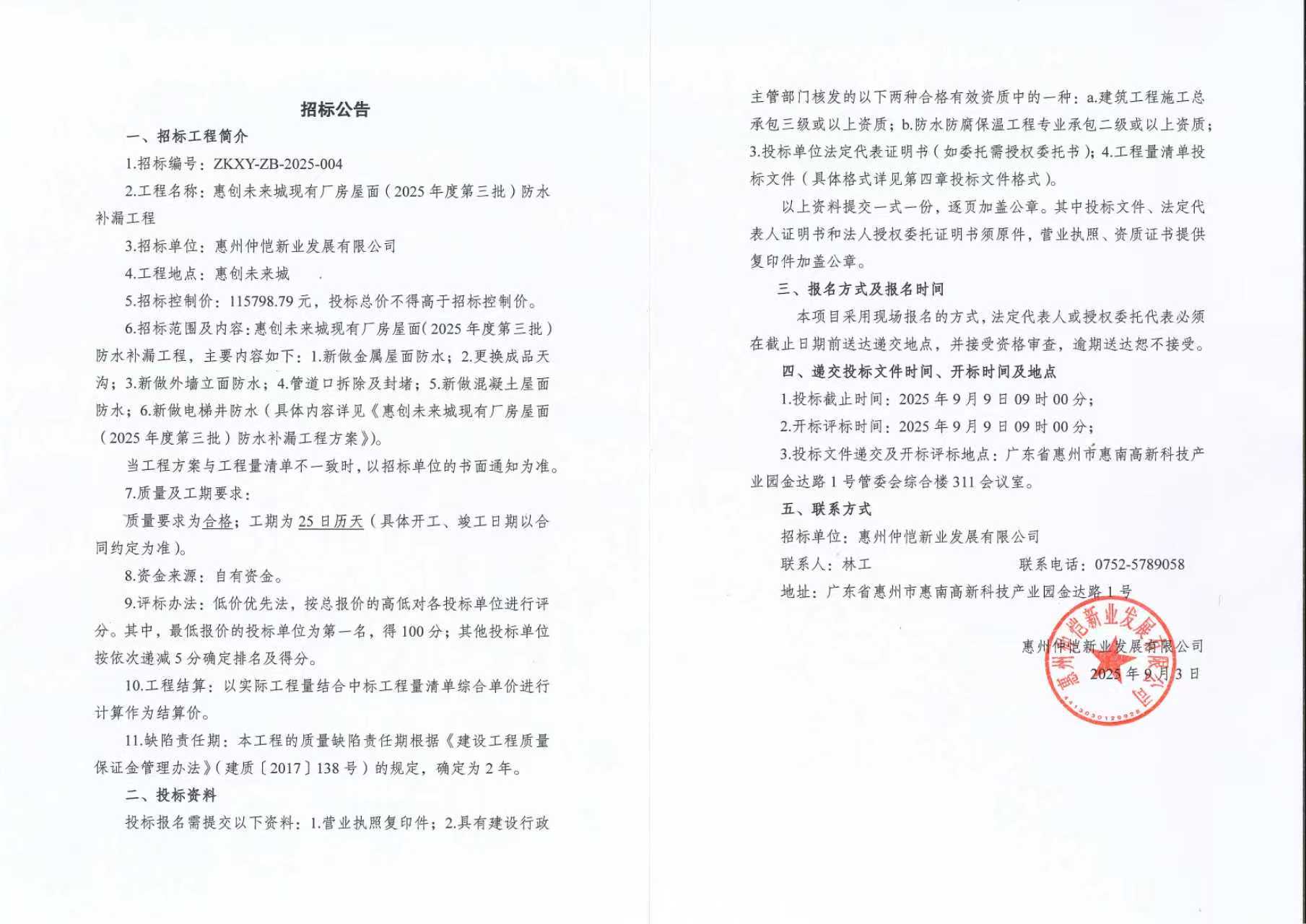 【招標(biāo)公告】惠創(chuàng)未來城現(xiàn)有廠房屋面(2025年度第三批)防水補(bǔ)漏工程