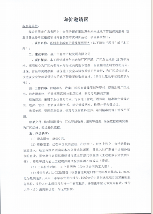 【詢價邀請函】惠創(chuàng)未來城地下管線探測服務