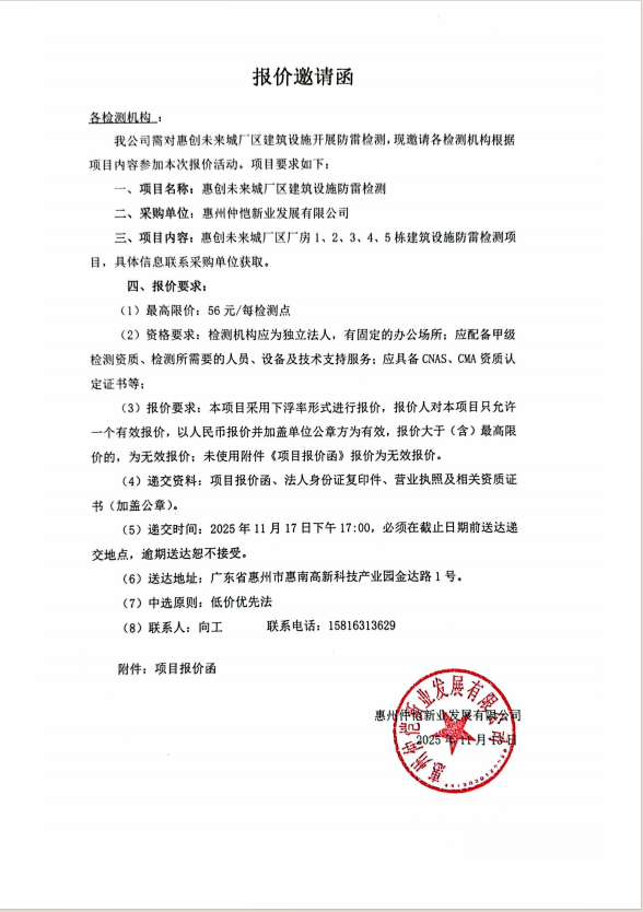 【報價邀請函】惠創(chuàng)未來城廠區(qū)廠房1、2、3、4、5棟建筑設施防雷檢測項目