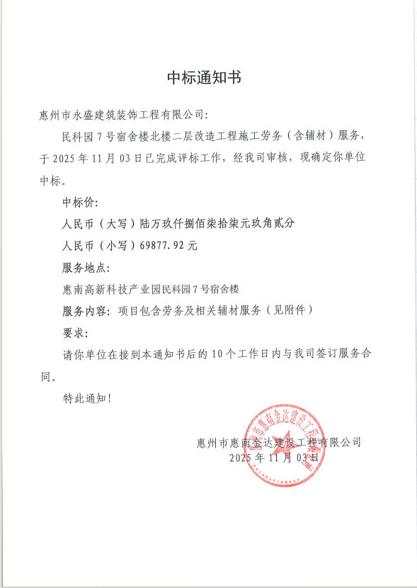 【中標(biāo)通知】民科園7號宿舍樓北樓二層改造工程施工勞務(wù)(含輔材)服務(wù)