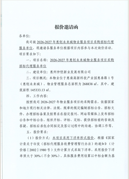 【報價邀請函】2026-2027年惠創(chuàng)未來城物業(yè)服務(wù)項目采購招標(biāo)代理服務(wù)單位