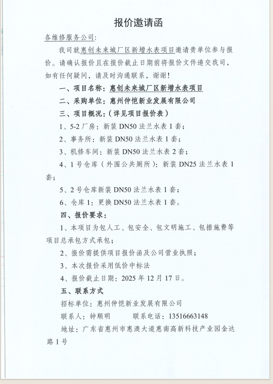 【報價邀請函】惠創(chuàng)未來城廠區(qū)新增水表項(xiàng)目