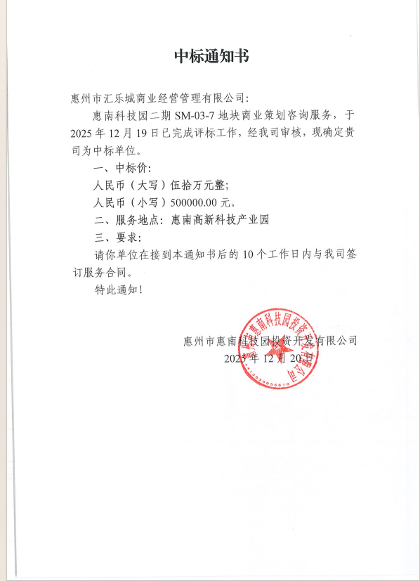 【中標(biāo)通知】惠南科技園二期SM-03-7地塊商業(yè)策劃咨詢(xún)服務(wù)