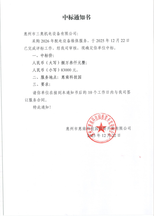 【中標通知】采購2026年配電設(shè)備維保服務(wù)