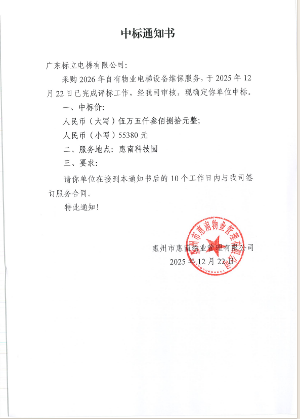 【中標(biāo)通知】采購(gòu)2026年自有物業(yè)電梯設(shè)備維保服務(wù)
