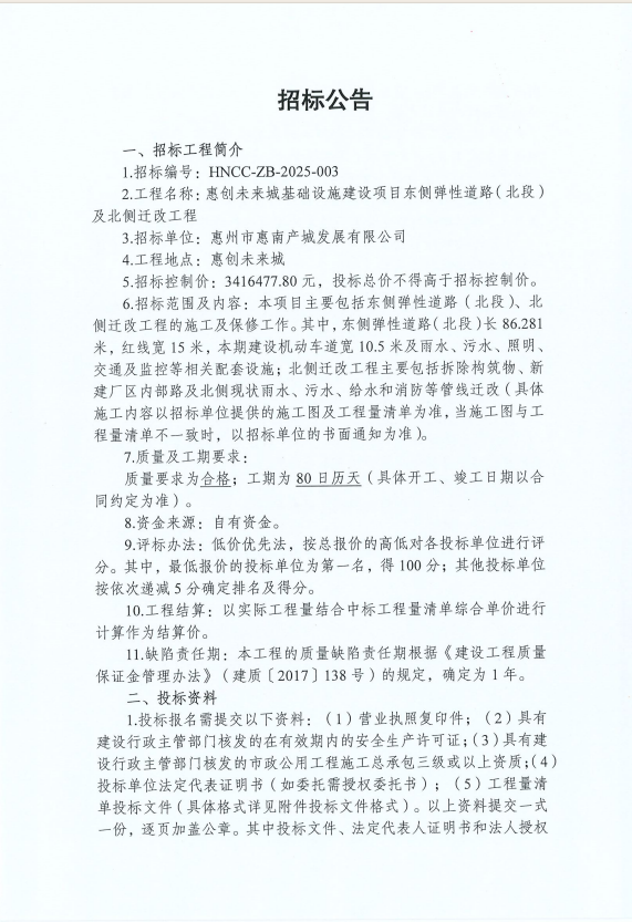 首頁 通知資訊 新業(yè)公司 【招標(biāo)公告】惠創(chuàng)未來城基礎(chǔ)設(shè)施建設(shè)項(xiàng)目東側(cè)彈性道路(北段)及北側(cè)遷改工程