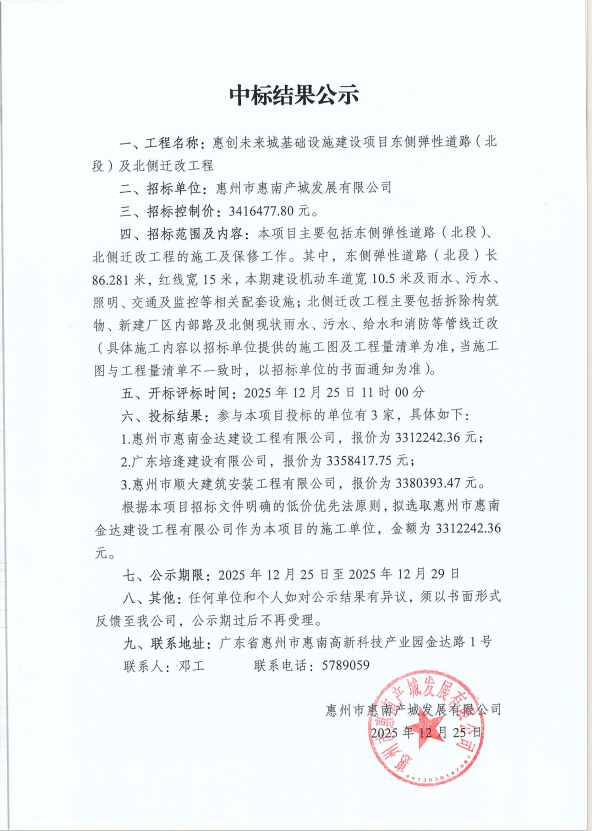 【中標結(jié)果公示】惠創(chuàng)未來城基礎設施建設項目東側(cè)彈性道路(北段)及北側(cè)遷改工程