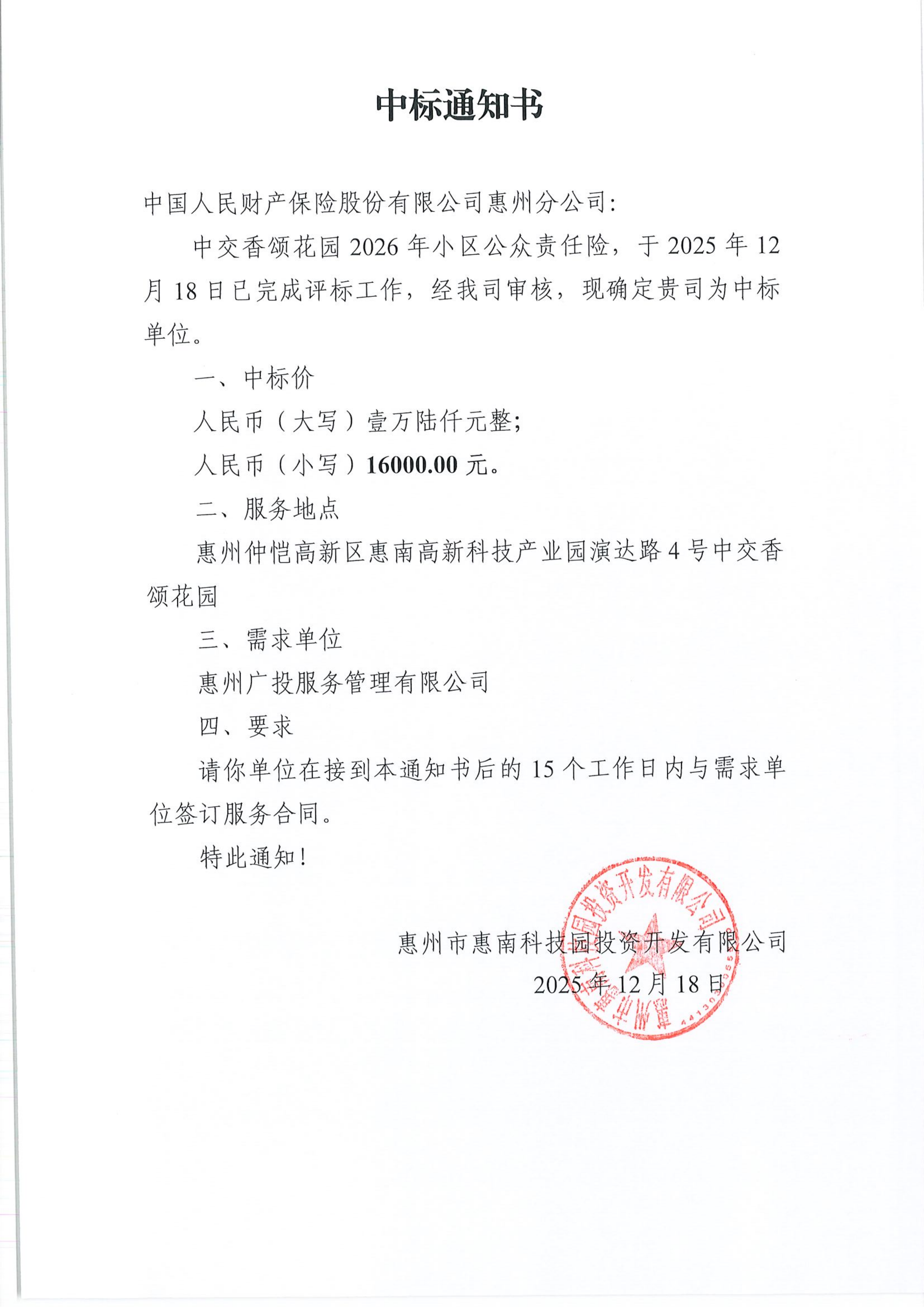 【中標通知】采購中交香頌花園2026年度小區(qū)公眾責任險項目