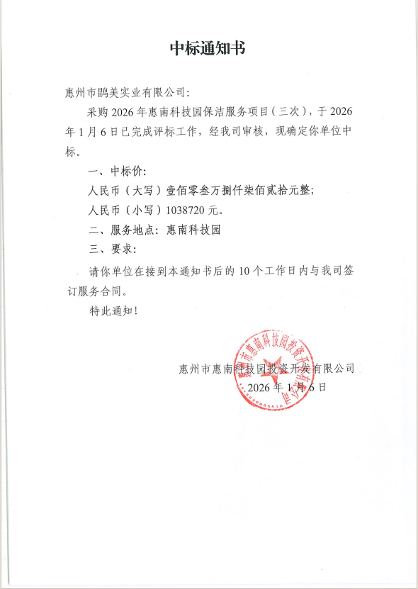【中標(biāo)通知】采購2026年惠南科技園保潔服務(wù)項(xiàng)目(三次)