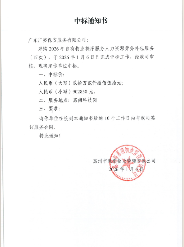 【中標(biāo)通知】2026年自有物業(yè)秩序服務(wù)人力資源勞務(wù)外包服務(wù)(四次)