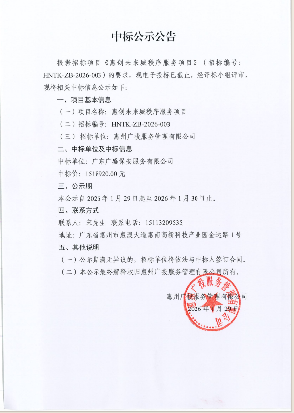【中標(biāo)公示】惠創(chuàng)未來城秩序服務(wù)項目